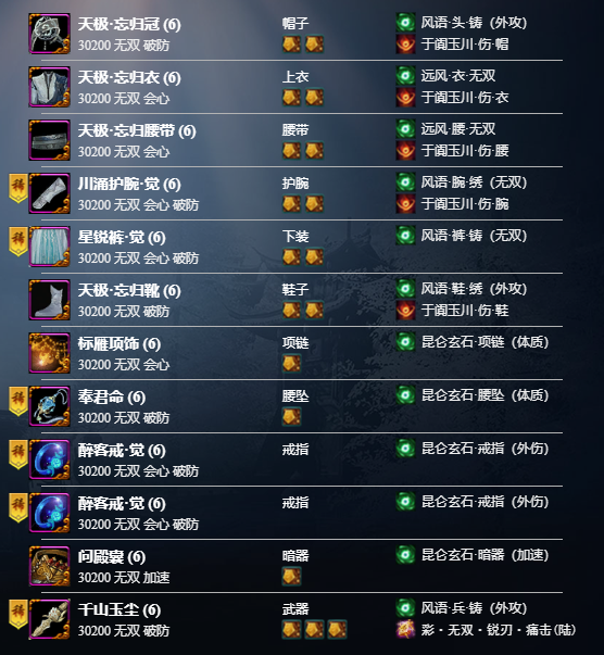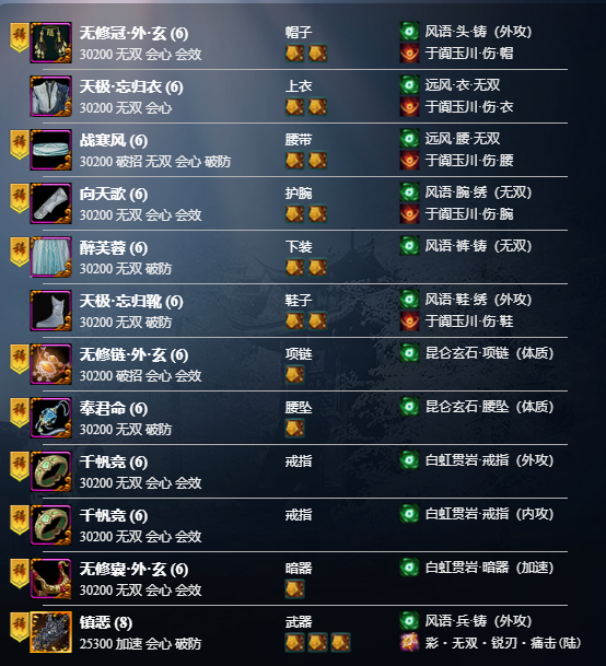 3、考虑性价比就四件套+向天歌+醉芙蓉+双会项链+特效腰坠+双会戒指+双会囊。究极拉满就是头换双会头,腰带换战寒风or寻故乡。(不必强求究极毕业,需要极致的手法+对副本机制足够熟悉的情况下才能体现出究极毕业的强度,根据自己实际情况选择。)
